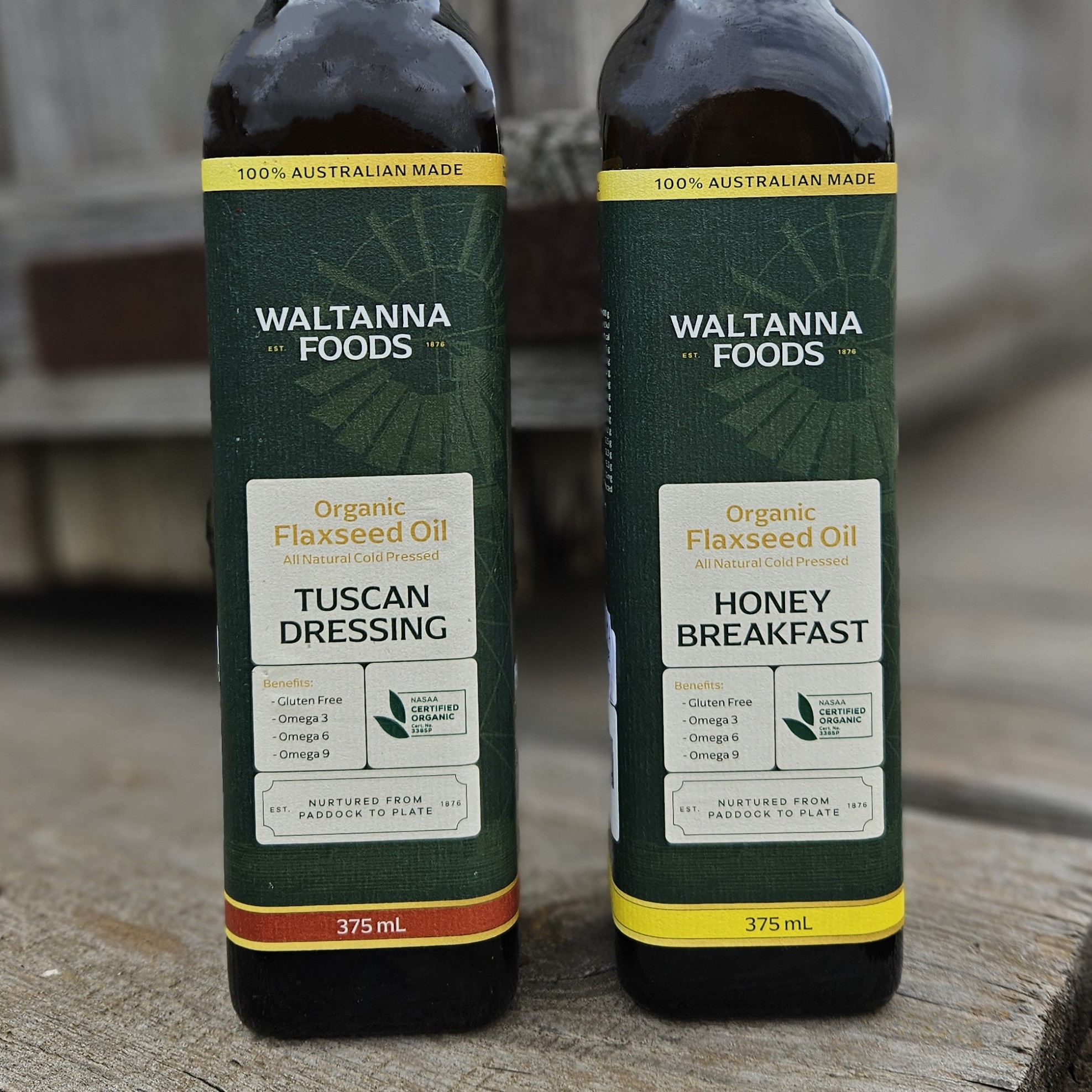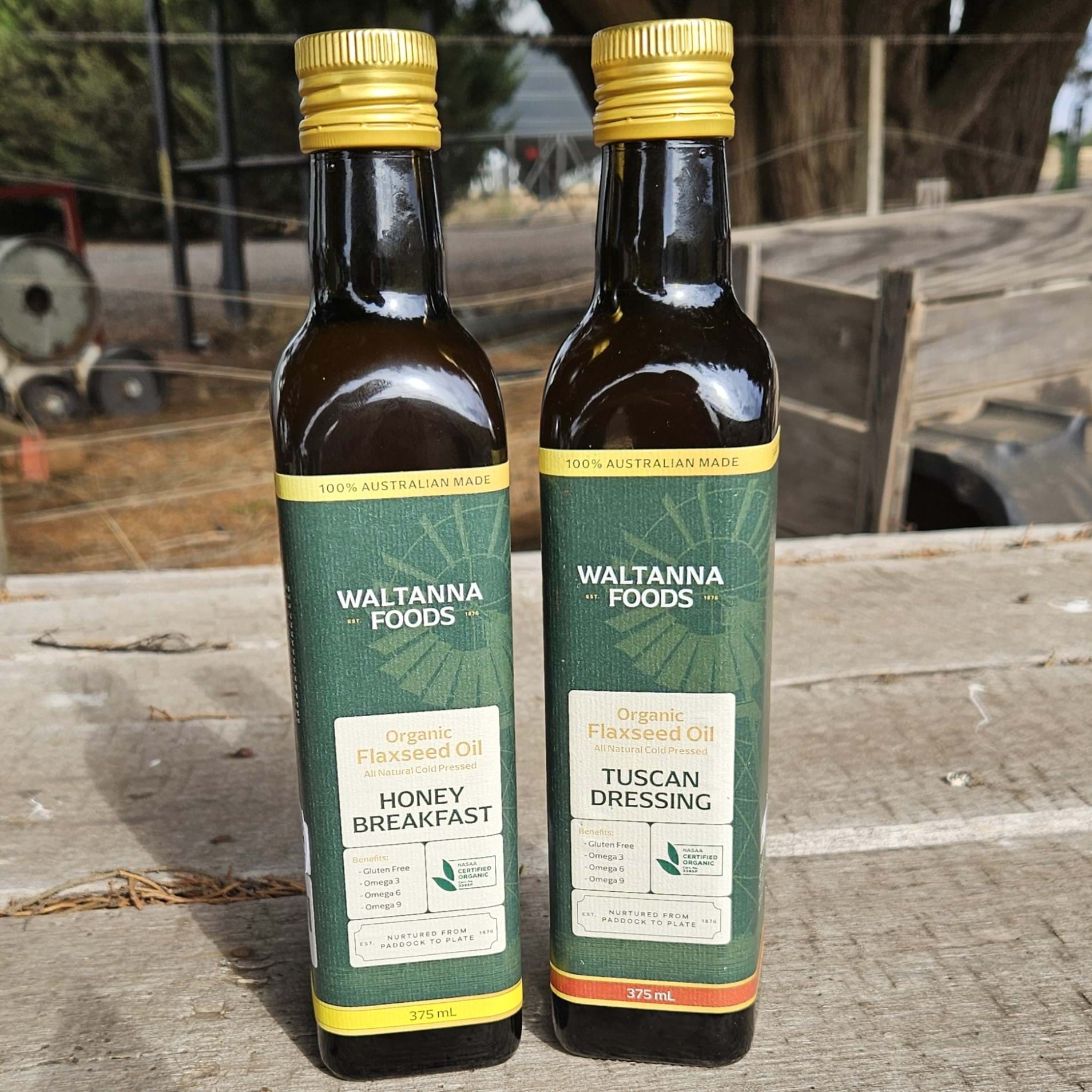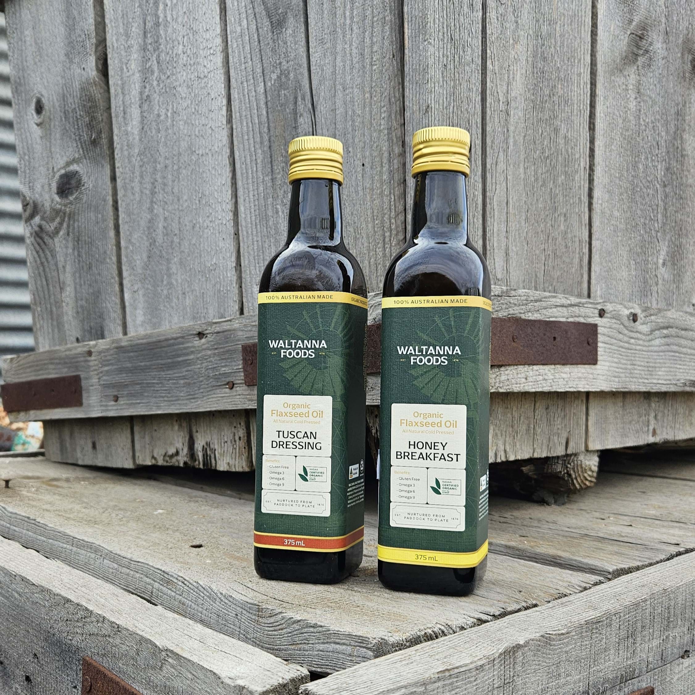 Waltanna Foods Oil Favourites Pack includes our two popular flavour infused Flaxseed Oils. These 375 mL flax oils are perfect to drizzle on summer salads, to create easy dips, add flavour boosts to your meals and to have on the dining room table when hosting special events. Waltanna Flaxseed Oil is grown and cold pressed on site at our family run farm located in Southwest Victoria at the foot of the Grampians mountain ranges. Our flaxseed oil is proudly 100% Australian grown and certified organic for over 20 years.