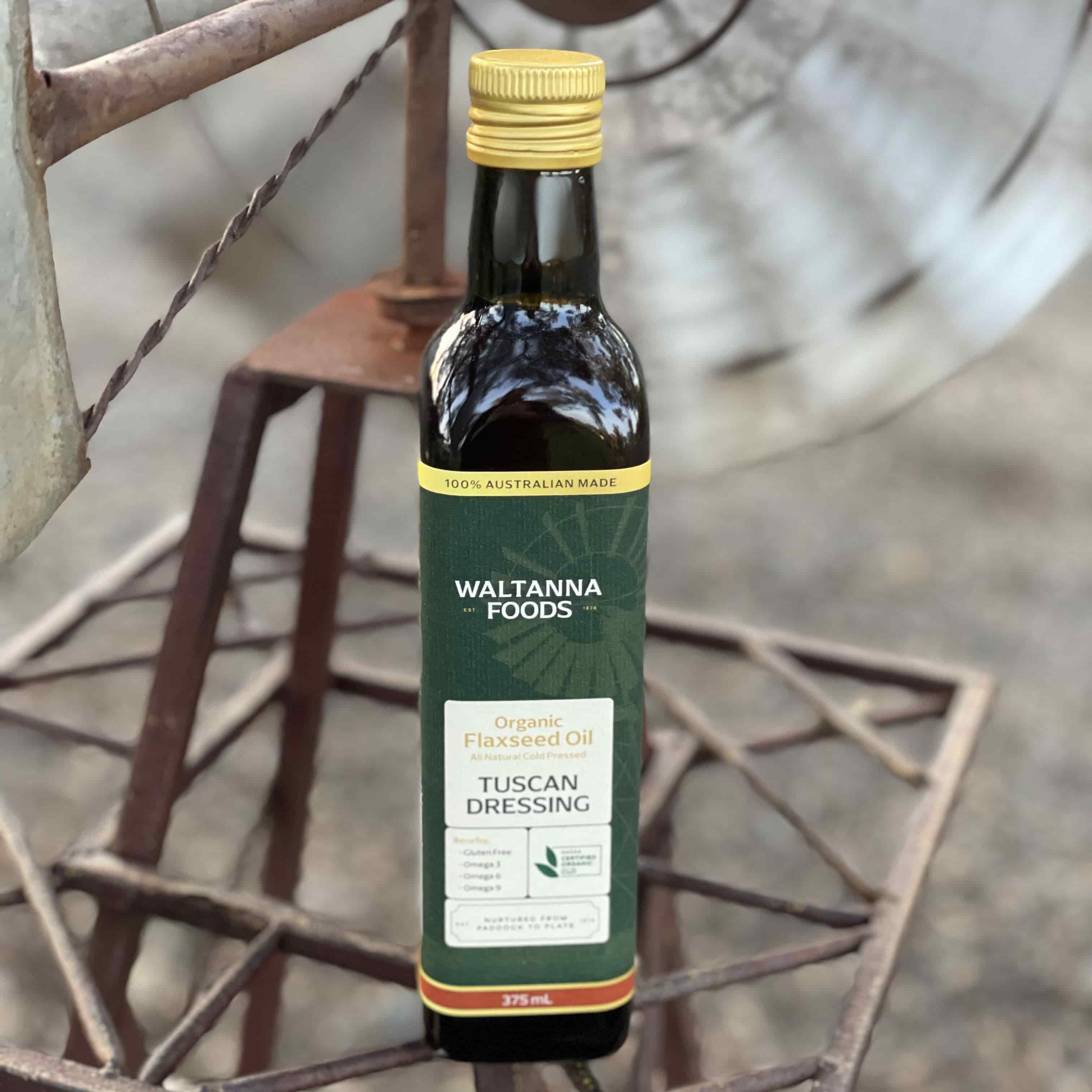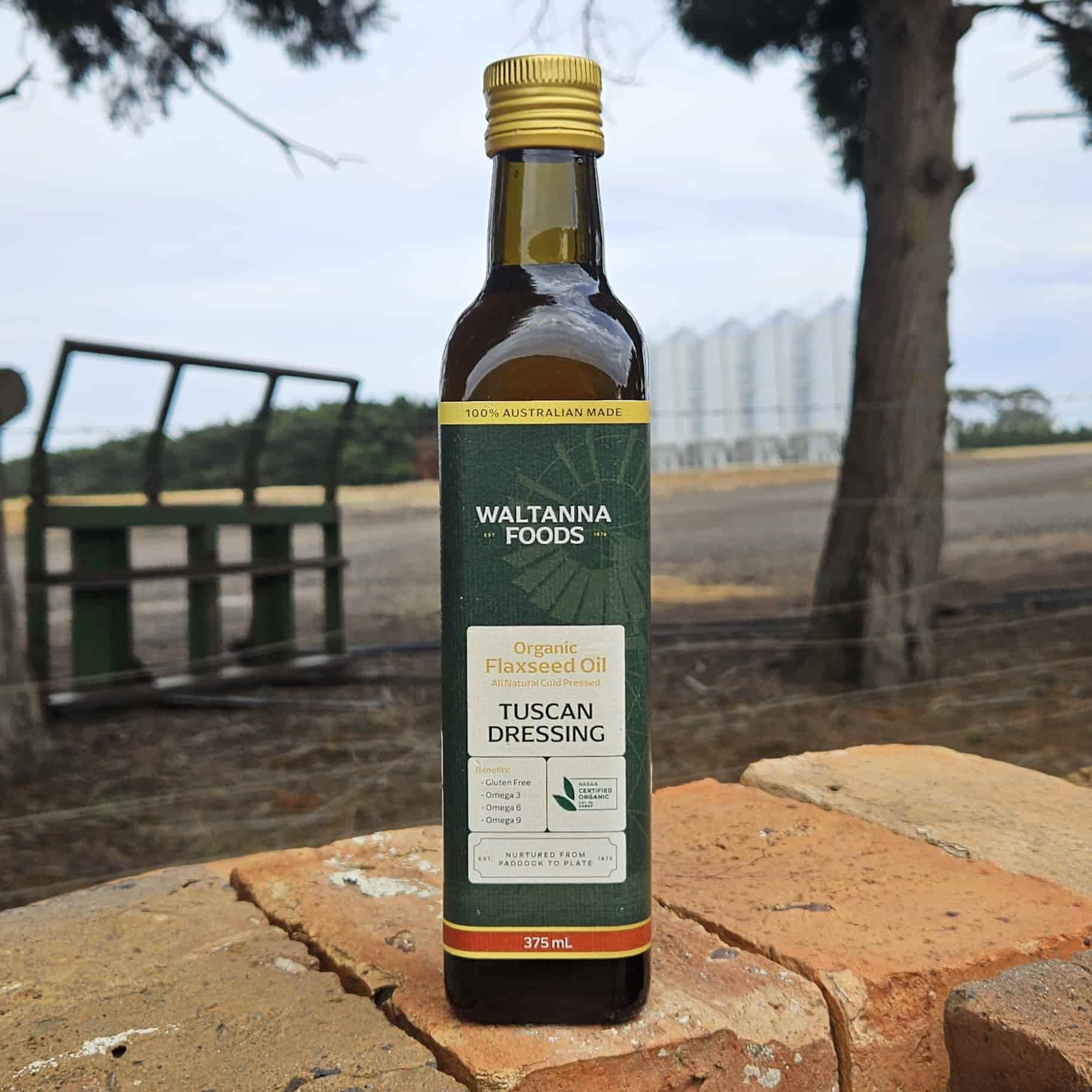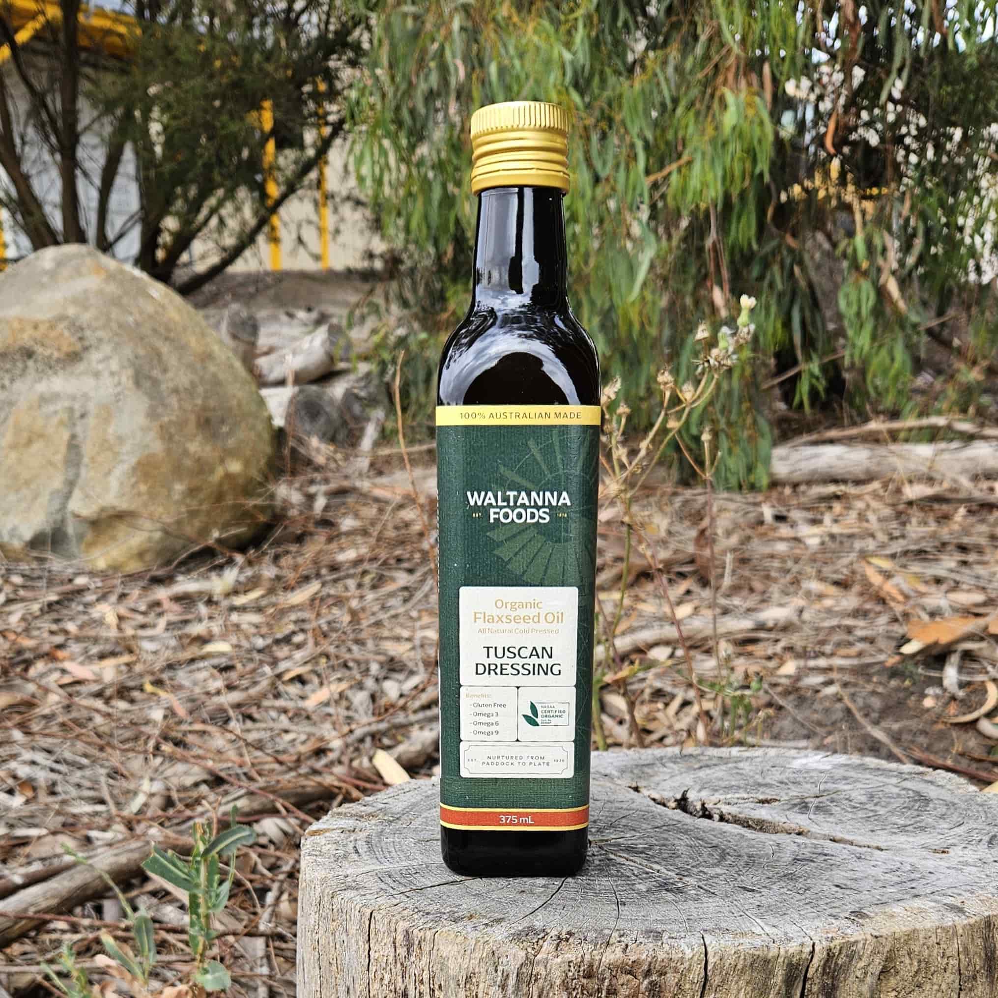Waltanna Foods Pure Golden Flaxseed Oil – Tuscan Dressing is a gluten free and certified organic flaxseed dressing made in South-West Victoria, Australia.